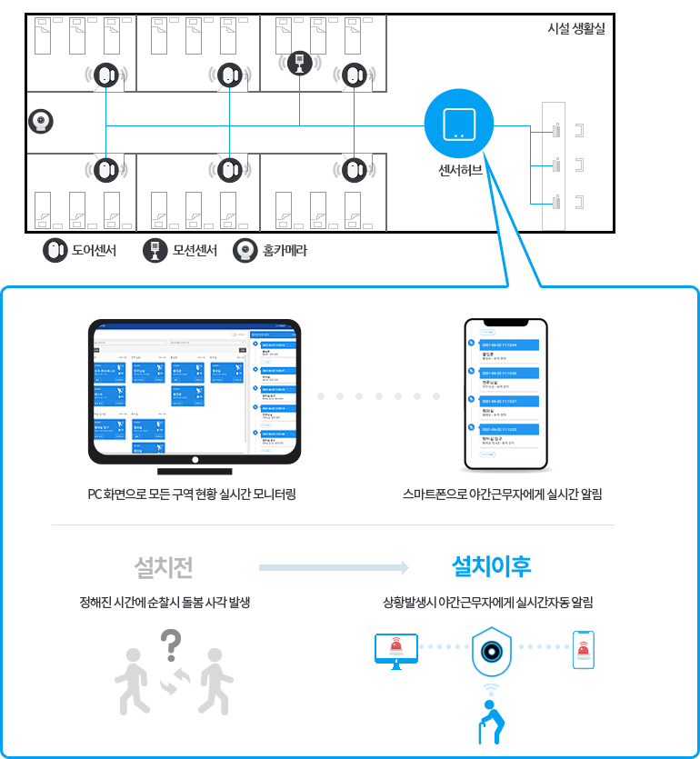 IOT 기술활용과 지능형 시스템을 통한 비대면 돌봄서비스이며, 돌봄서비스 공백이 발생할 수 있는 심야시간의 위험,상태정보 감지 및 관리자 알림을 통하여 돌봄 사각지대를 최소화 합니다.